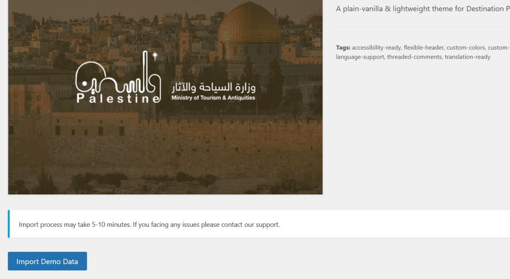 Congratulations! You have successfully set up the Destination Palestine WordPress theme and configured the required plugins. Your website should now have the initial structure and design as demonstrated in the theme demo.